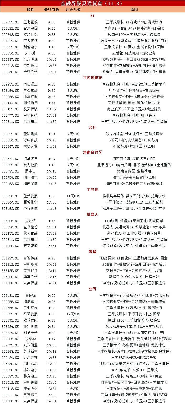 AI概念反复活跃,吉视传媒、三七互娱等涨停;可控核聚变概念走强,海陆重工等涨停。